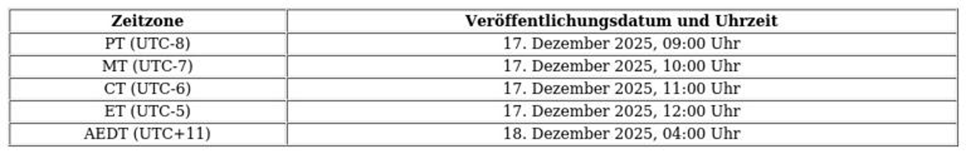 Auf europäischen Servern beginnt die Veröffentlichung um 12:00 Uhr MEZ (UTC+1).