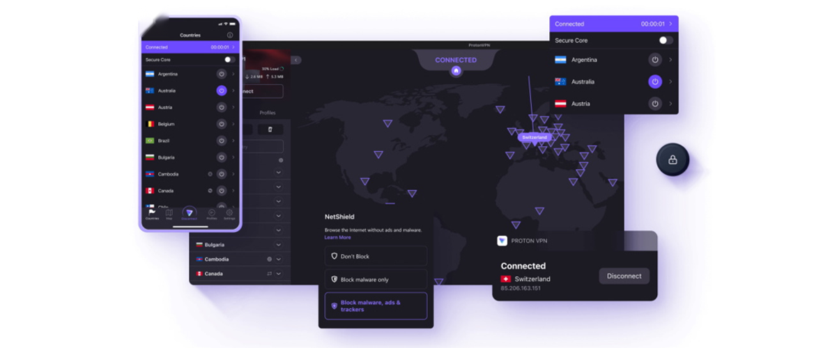 Apps are available across Windows, macOS, iOS, Android and Linux, and the interface includes a neat map view that visualizes every available server location\n
