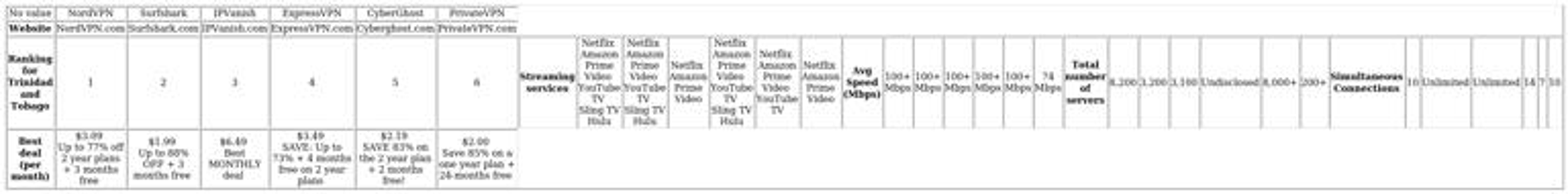 Below are the VPNs we recommend for users in Trinidad and Tobago: Oct 2025If you need a VPN for use in Trinidad and Tobago, NordVPN is our top pick thanks to its reliable speeds and strong unblocking ability.